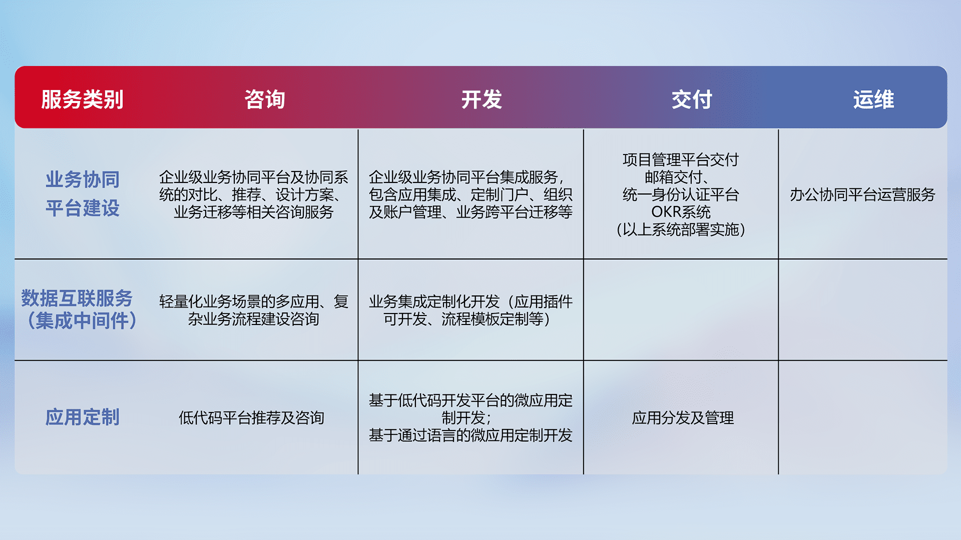 针对钉钉、、企微、、IDaas等平台级产品提供产品的规划、、、、方案、、、、交付、、定制化开发等服务,,实现如统一协同办公、、、智能客户服务、、混合会议管理、、、、智能数据查询、、等业务场景,,,,实现数字化转型。。